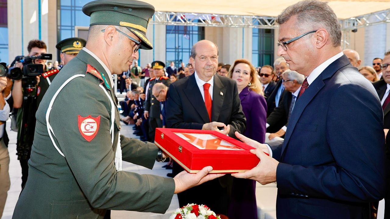 Konuşmaların ardından Cumhurbaşkanlığı forsu gönderden indirilerek Erhürman’a takdim edildi, yeni Cumhurbaşkanlığı forsu göndere çekildi.