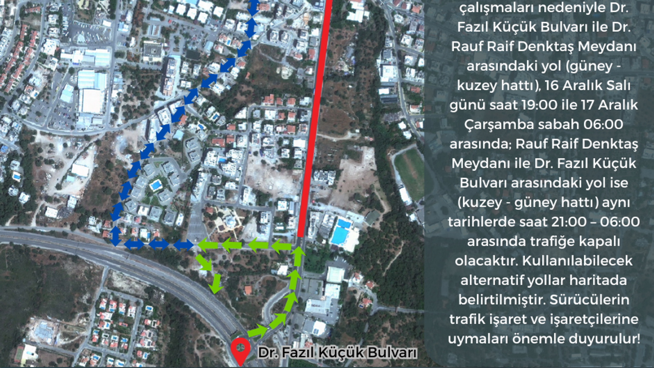 Açıklamaya göre; Dr. Fazıl Küçük Bulvarı ile Rauf Raif Denktaş Meydanı arasındaki yolun güney – kuzey hattı, bu akşam saat 19.00’dan yarın sabah 06.00’ya kadar trafiğe kapalı olacak.