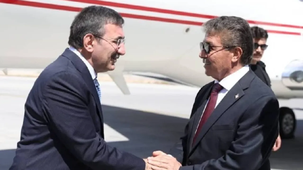 Cevdet Yılmaz, Ercan Havalimanı’nda Başbakan Ünal Üstel ile birlikte basın açıklaması yapıyor.