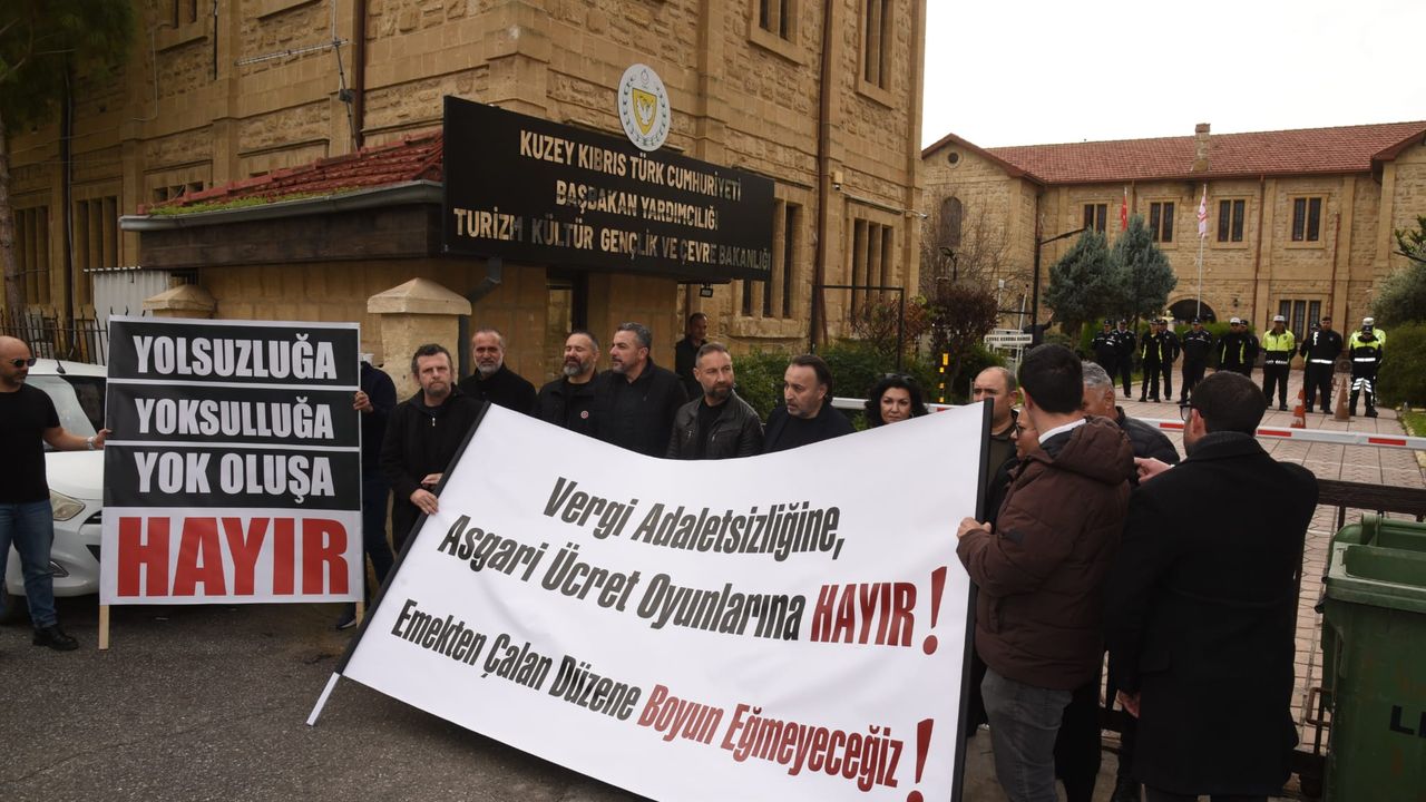 Lefkoşa Terminal Çemberi’nde toplanan Kıbrıs Türk Amme Memurları Sendikası (KTAMS), Kıbrıs Türk Kamu Görevlileri Sendikası (KAMUSEN), Kamu İşçileri Sendikası (KAMU-İŞ), Kıbrıs Türk Öğretmenler Sendikası (KTÖS) ve Kıbrıs Türk Orta Eğitim Öğretmenler Sendikası (KTOEÖS) yetkilileri, sloganlarla Başbakan Yardımcılığı, Turizm, Kültür, Gençlik ve Çevre Bakanlığı önüne yürüdü.
